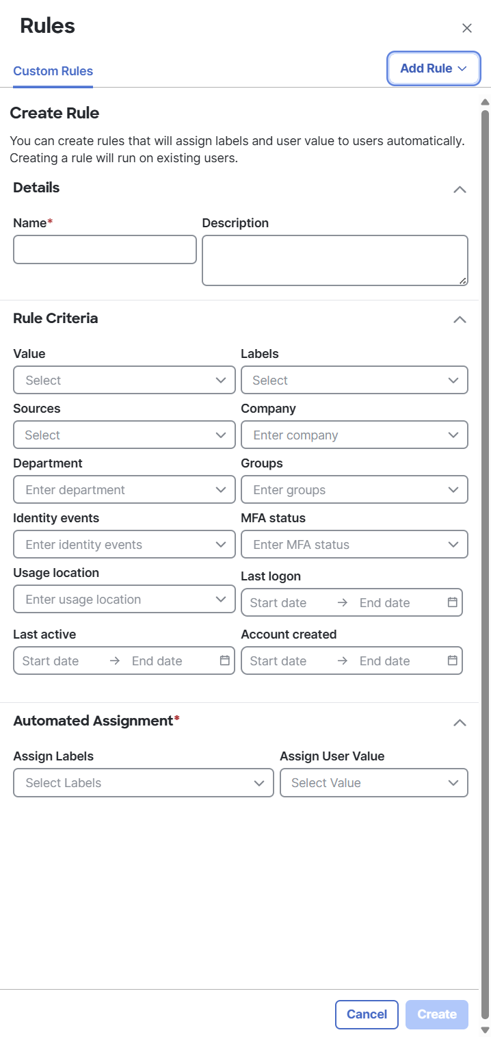 The Rules drawer allows you to manage rules that will assign labels and values to users automatically.