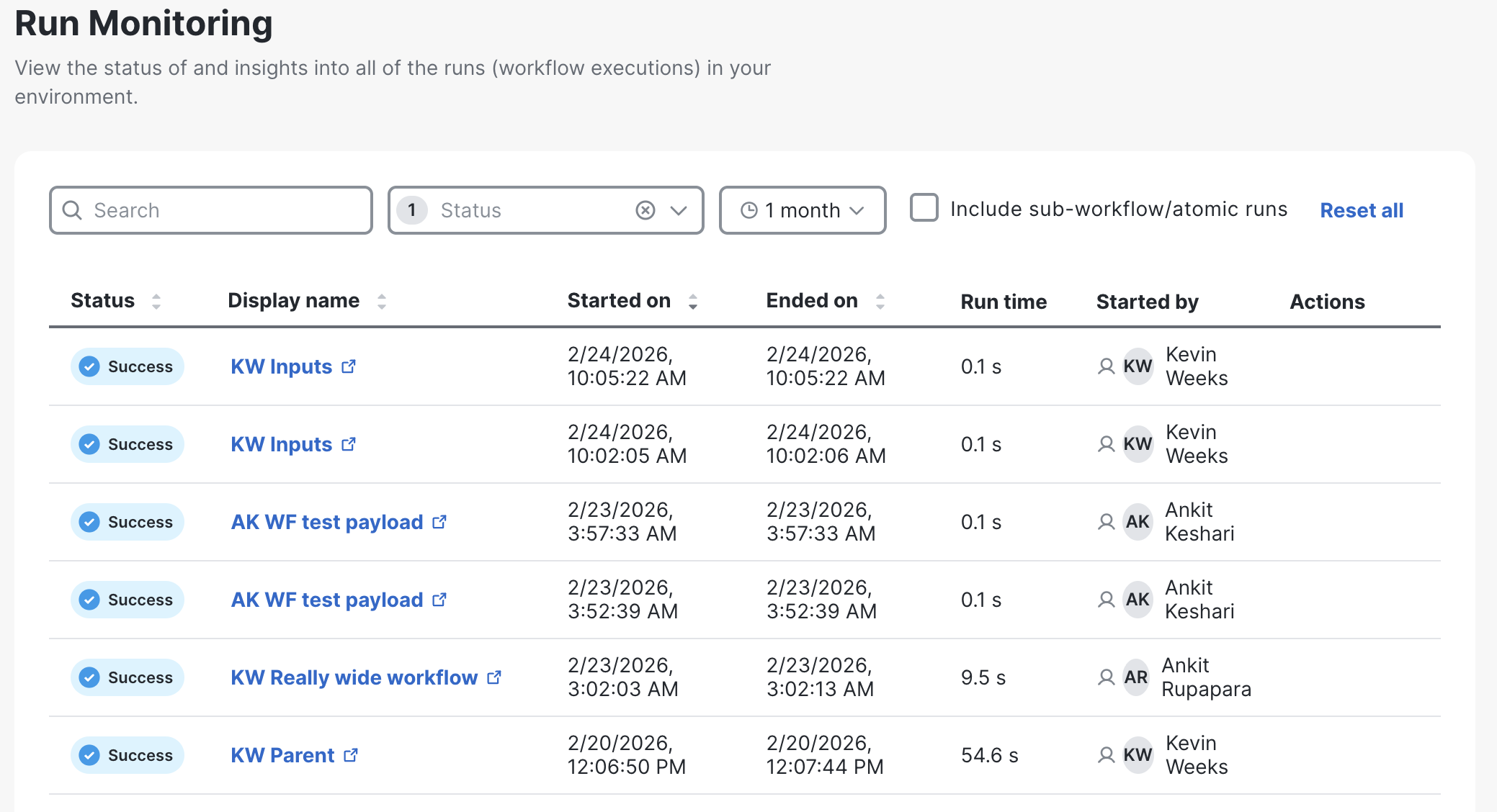 View the Run Monitoring page to check the status of and inspect the workflow executions in your environment.
