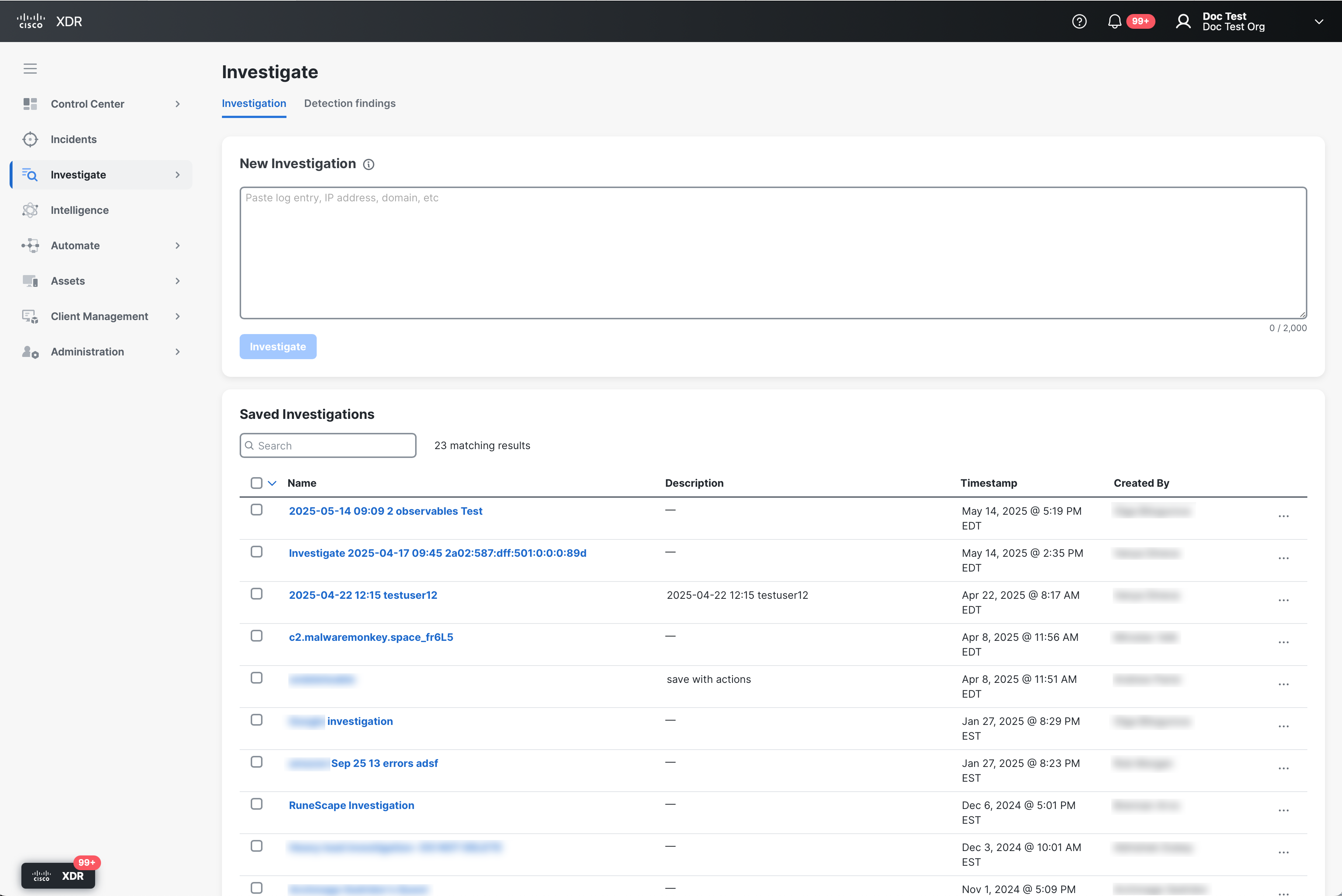 You can search, view, share, download, and delete saved investigations.