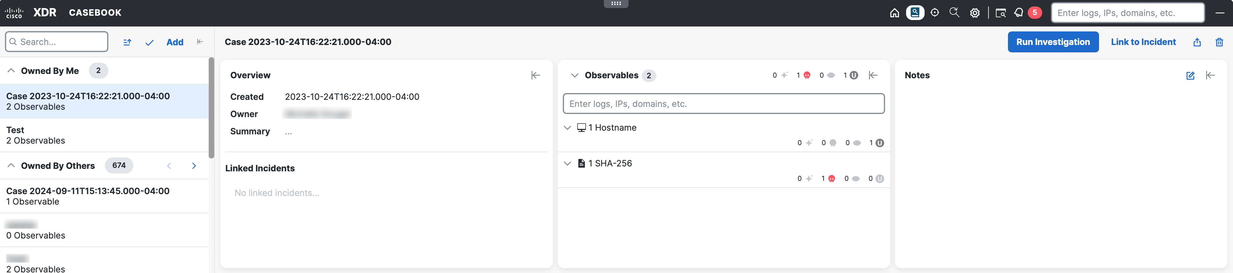 A case does not include dispositions, events, or other temporal or enrichment-based information. It is primarily a container for observables so that all of the observables in the case can be investigated quickly or added to incidents. You can optionally include any analyst notes to the case as you follow leads during your threat investigation.