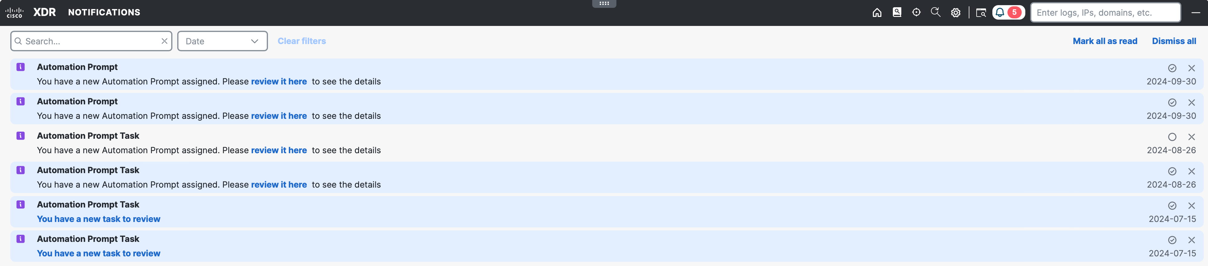 Use this page to view, search, filter, and remove notifications. You can access the Notifications page by clicking the