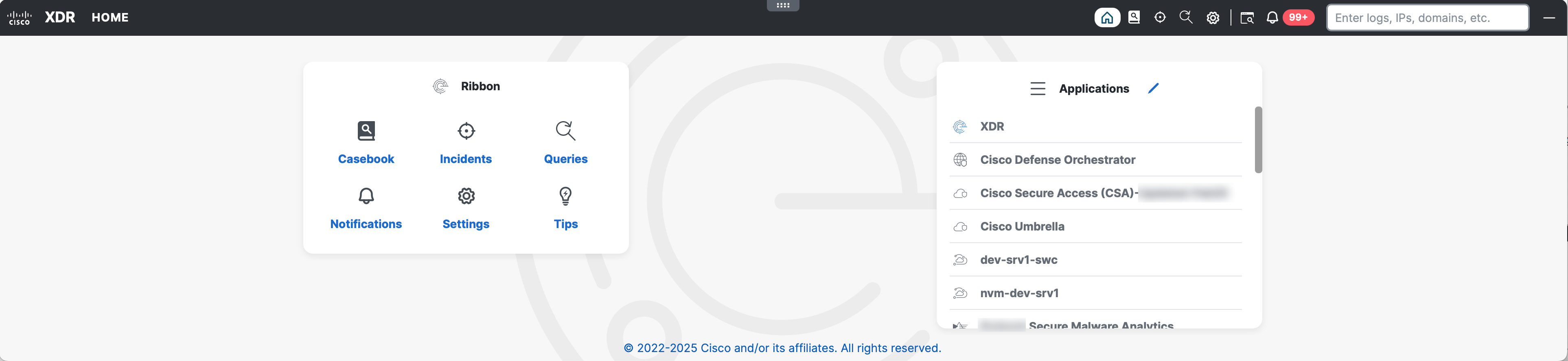 Cisco XDR is both a centralized console and a distributed set of capabilities that unify visibility, enable automation, accelerate incident response workflows, and improve threat hunting. These distributed capabilities are presented in the form of applications (apps) and tools in the Cisco XDR ribbon.