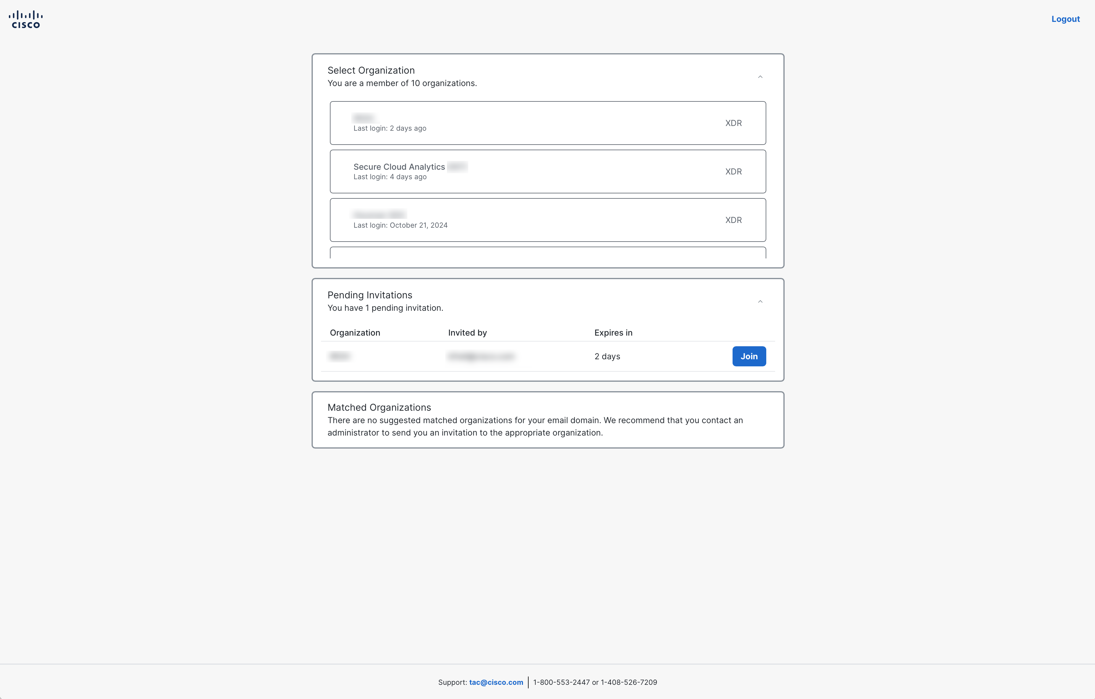 Select Organization - If you are a member of two or more organizations, when you sign in to your Security Cloud Sign On account, a list of organizations is displayed in the Select Organization area. Click the organization card to log in to Cisco XDR for the selected organization. The date you last logged in to the organization and the application label (XDR) are also displayed. The XDR application label indicates that the current organization is a Cisco XDR organization.